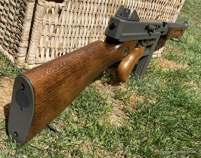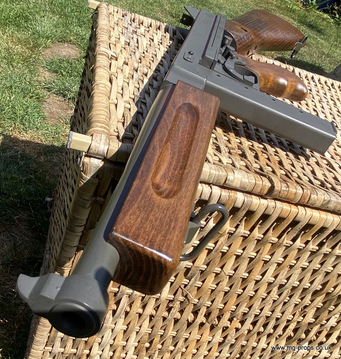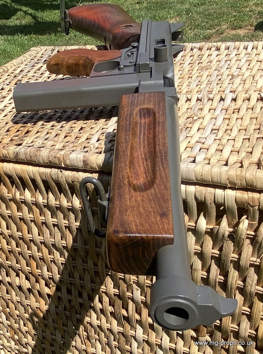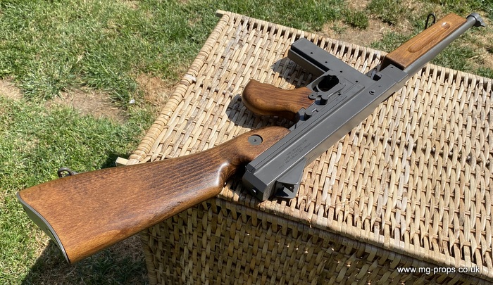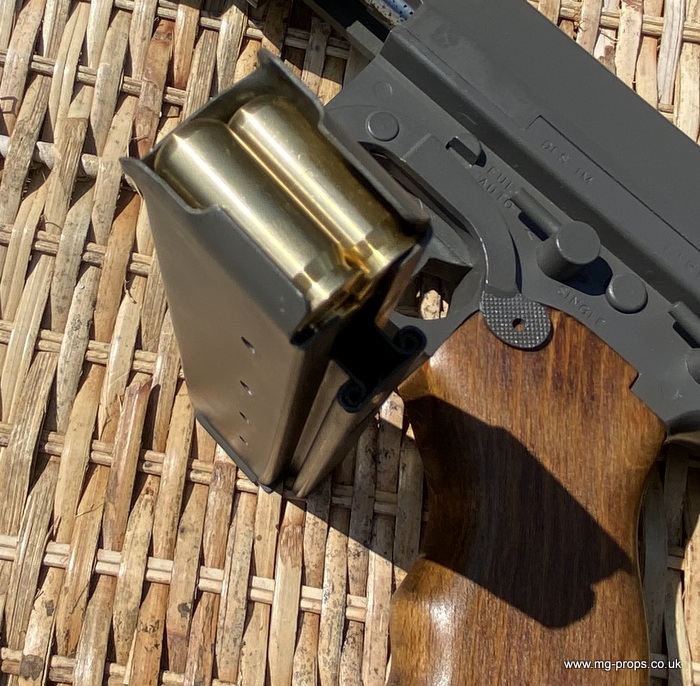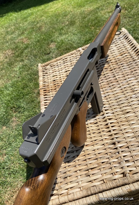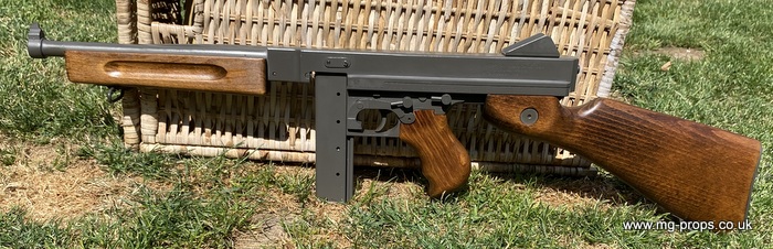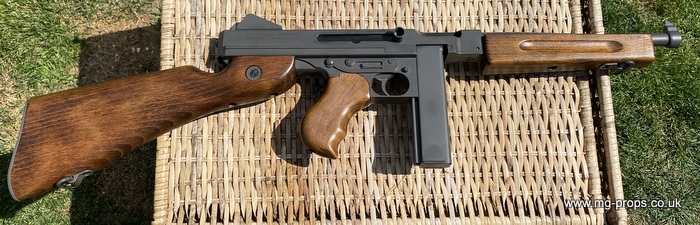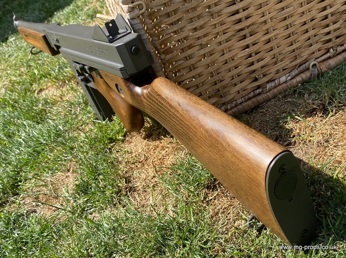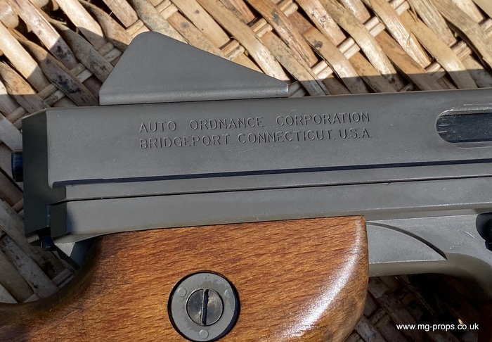 "Thompson Submachine Gun Caliber .45 M1" "Auto Ordnance Corporation Bridgeport Connecticut U.S.A" Just like the original including same markings for the fire / saftey selectors. Weight: 4.6Kg Construction: Metal & Wood Operation: Blowback Cartridge Selective Fire: Semi + Full Automatic Magazine Capacity: 20x .45ACP blowback cartridges Optional: 30 round magazine We ship internationally. Please ask for a shipping quote: sales@mg-props.co.uk