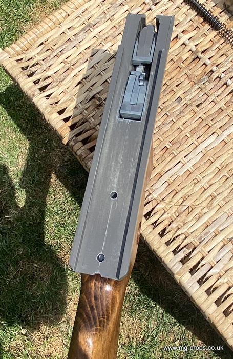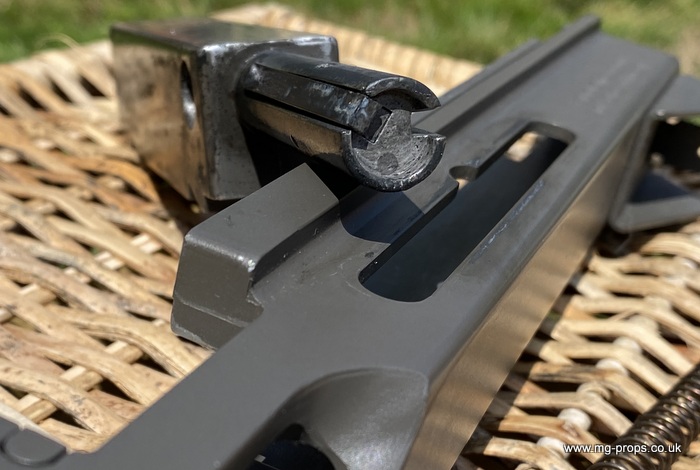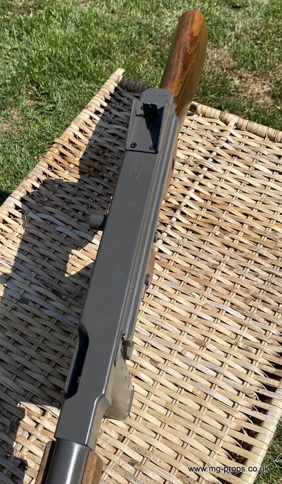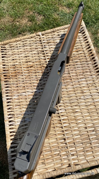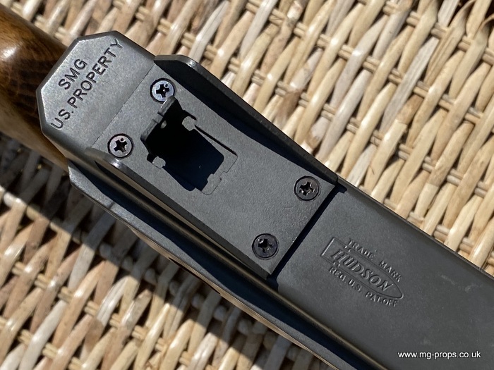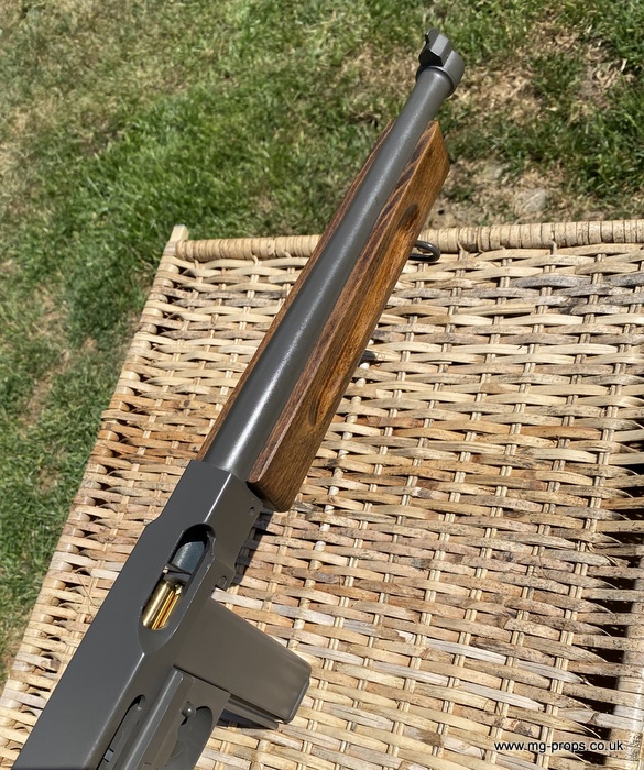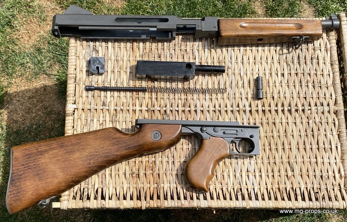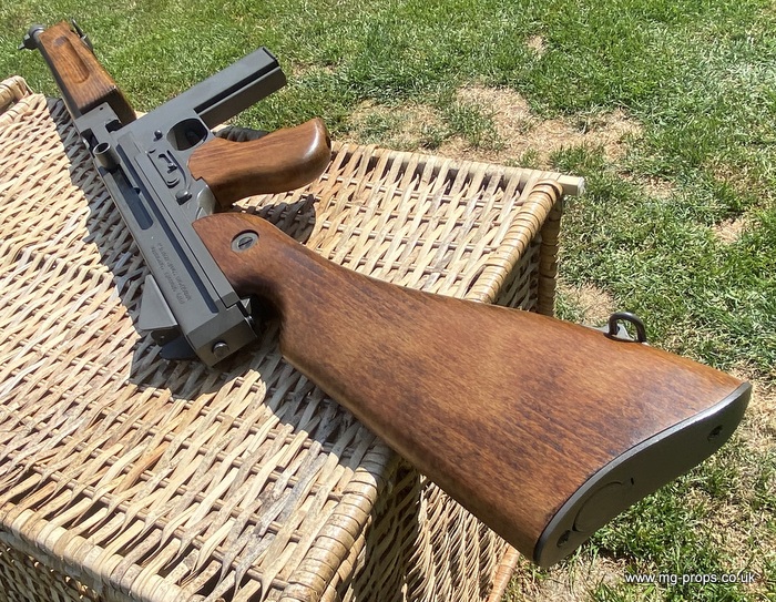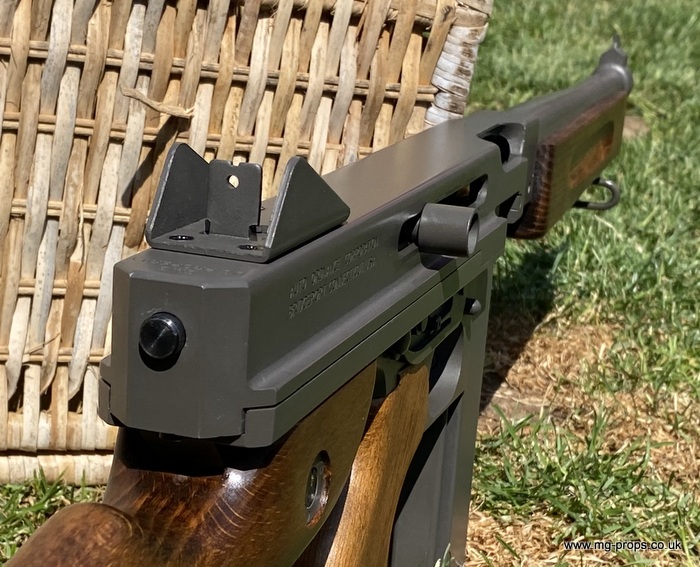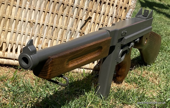 "Thompson Submachine Gun Caliber .45 M1" "Auto Ordnance Corporation Bridgeport Connecticut U.S.A" Just like the original including same markings for the fire / saftey selectors. Weight: 4.6Kg Construction: Metal & Wood Operation: Blowback Cartridge Selective Fire: Semi + Full Automatic Magazine Capacity: 20x .45ACP blowback cartridges Optional: 30 round magazine We ship internationally. Please ask for a shipping quote: sales@mg-props.co.uk