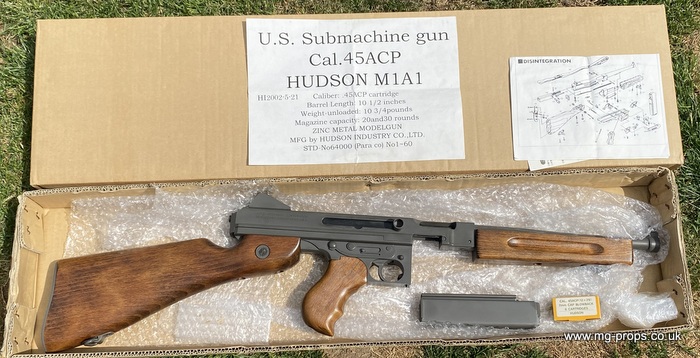 WWII Hudson Thompson M1A1 One of the latter ones made in the 1990's by Hudson firing the latest/last new type .45ACP cartridges Very rare limited edition factory Parkerized version In excellent throughout both externally and internally. Appears unfired, almost new condition !! Very nice dark wood furniture Photos above of actual M1A1 for sale Great Thompson for a re-enactor, collector or film/theatre. All works exactly as it should. Photos above of actual Thompson for sale. Includes: Original box, original instructions, Parkerized Hudson 20rd magazine, 6x New .45ACP blowback cartridges (reusable), latest new type Functions, fieldstrips like the real thing! Front venting Fully constructed of metal and wood, there is no plastic whatsoever anywhere. Nicely marked with Thompson markings Open barrel, vents out of the end of barrel (see video above of the Hudson front venting Thompson M1A1 in action) Very heavy weighing in 4.6Kg (unloaded) The Thompson will operate exactly like the real thing It is engineered precisely like the original, and also operates like the original in every way, such as: Side cocking handle, safety selector, selectable fire: Semi and Full auto, loading, ejection of rounds, magazine loading/ removal, locking. ect. Internals are also copied which provides very much same fire rate and fieldstrip is exactly like the original.