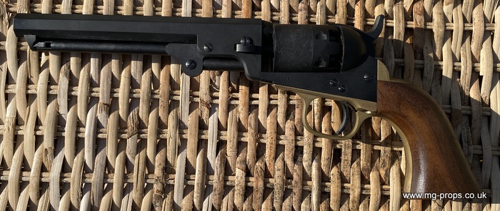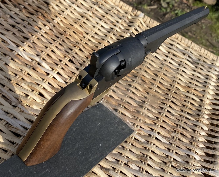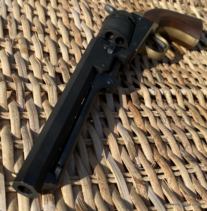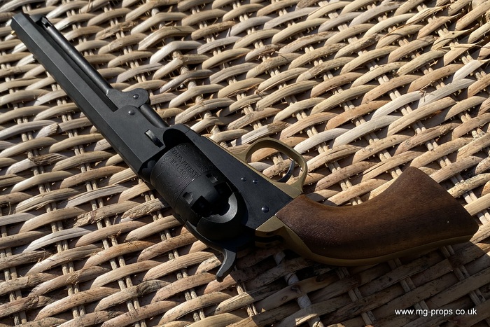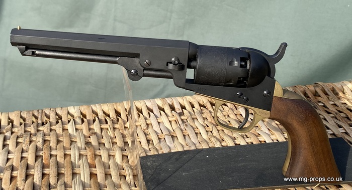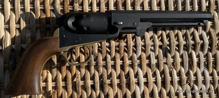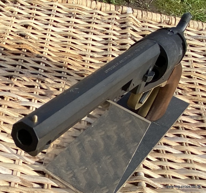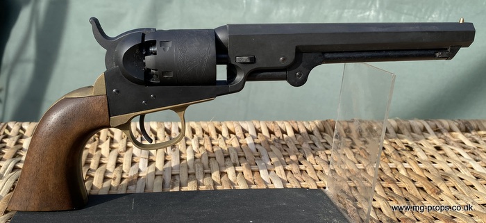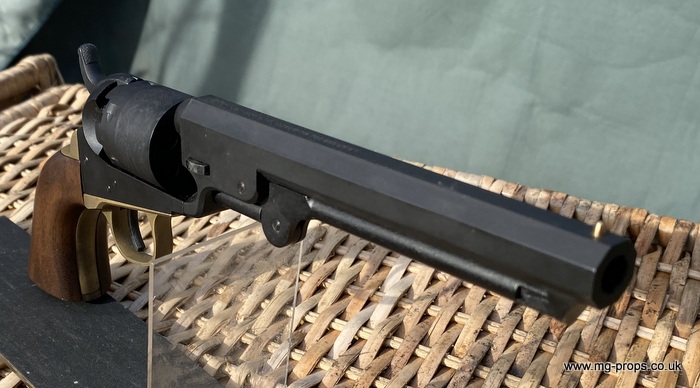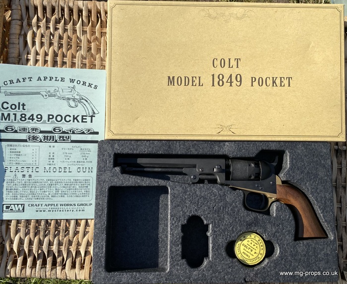 This is a superb replica of the Colt 1849 Pocket Percussion Revolver 6in Barrel Version with Real Wood Grips and Matching Serial Numbers Made from heavyweight abs & zinc alloy parts has a metal look and cold to the touch. Weight: 620g Brass Frame, Trigger Guard Barrel Length : 6in 6 Shot with 6x Percussion containers included which a 5mm PFC Primer Cap fits into (PFC caps not included) Serial Number : 4140 Very nice weight, feel and action No visible makers name Functions, Fires, Field-strips like the real thing ! Photos above of actual revolver for sale In very good condition, light handling use / un-fired Rare chance to purchase this superb replica which is no longer produced Includes original box, original instructions, 1x Tin of 6x percussion containers for which a 5mm cap fits in (for a loud bang!) PFC caps not included. Open Barrel for venting Strips down like the real thing ! UK Customers: This is VCRA Exempt. Just need to be over 18yrs old to purchase We ship internationally. Any questions please let us know: sales@mg-props.co.uk PFC Primer caps: £9.50 per box (1 box = 100 PFC caps) These are needed to make the bang and smoke! Brief info on the COLT 18949 Pocker Colt Model 1849 Pocket Revolver The Pocket Model is smaller than none revolvers. The trigger guard is slightly oversized to accept a normal finger, but the grip is a bit petite for most folks. However, this made the gun concealable, and that was the point. The Model 1849 Pocket Revolver, a replacement for the Baby Dragoon, was the most widely produced of any Colt percussion pistol. Nearly 340,000 were manufactured during a 23-year production run that ended in 1873. Although most production took place in Colt's Hartford factory, approximately 11,000 were made in London. These pistols were available with octagonal barrels ranging between 3 and 6 inches in length. The 1849 Pocket Model featured a brass frame, trigger guard, and a latched loading lever. One common but potentially apocryphal application was that Civil War officers purportedly kept the little guns handy to dissuade their Army surgeons from removing limbs unnecessarily.