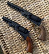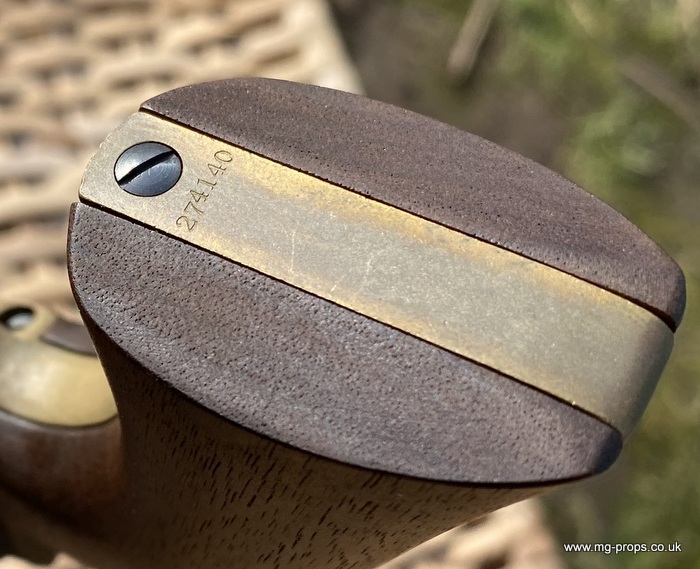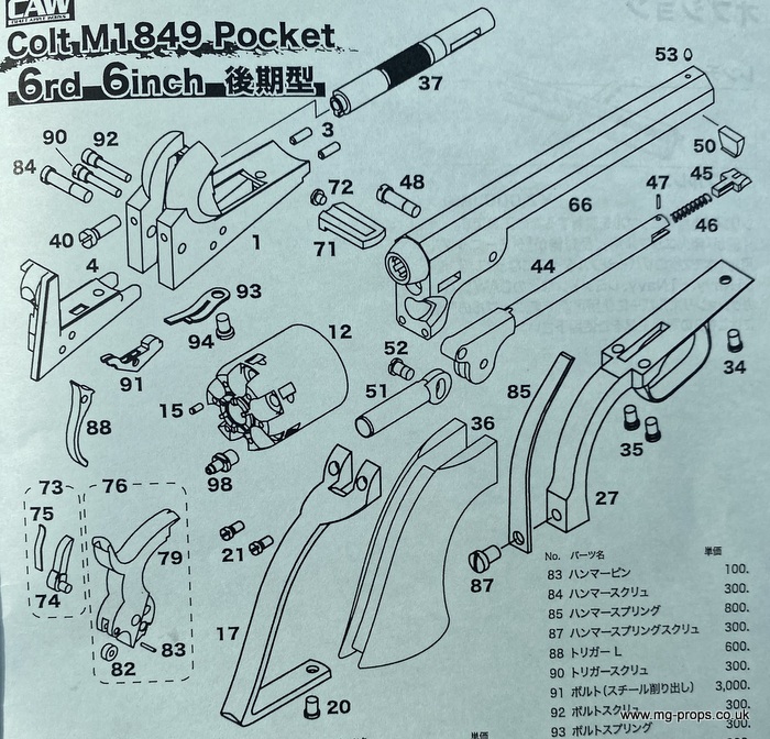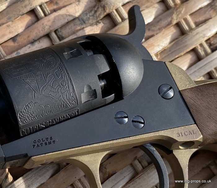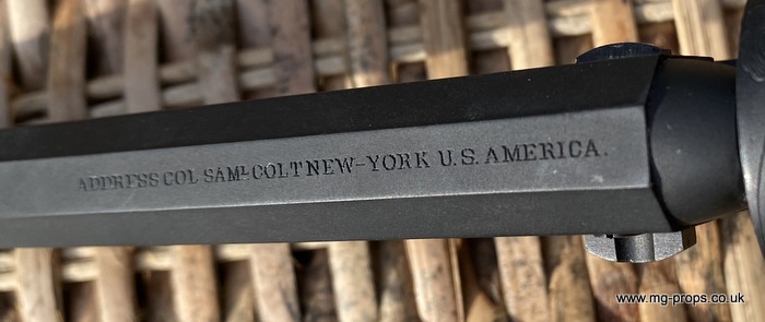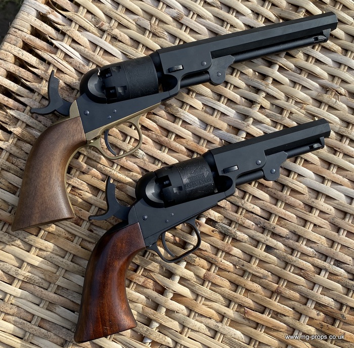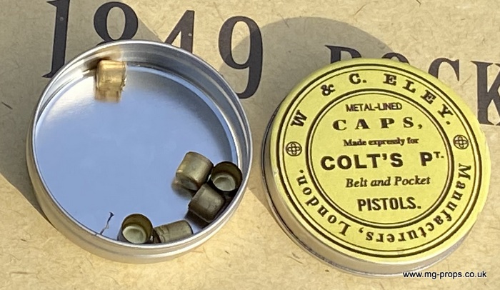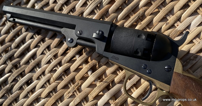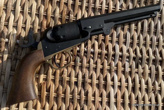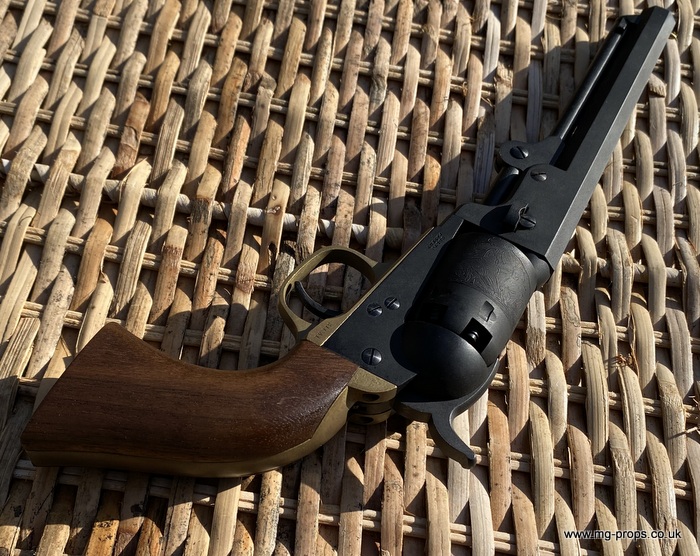 This is a superb replica of the Colt 1849 Pocket Percussion Revolver 6in Barrel Version with Real Wood Grips and Matching Serial Numbers Made from heavyweight abs & zinc alloy parts has a metal look and cold to the touch. Weight: 620g Brass Frame, Trigger Guard Barrel Length : 6in 6 Shot with 6x Percussion containers included which a 5mm PFC Primer Cap fits into (PFC caps not included) Serial Number : 4140 Very nice weight, feel and action No visible makers name Functions, Fires, Field-strips like the real thing ! Photos above of actual revolver for sale In very good condition, light handling use / un-fired Rare chance to purchase this superb replica which is no longer produced Includes original box, original instructions, 1x Tin of 6x percussion containers for which a 5mm cap fits in (for a loud bang!) PFC caps not included. Open Barrel for venting Strips down like the real thing ! UK Customers: This is VCRA Exempt. Just need to be over 18yrs old to purchase We ship internationally. Any questions please let us know: sales@mg-props.co.uk PFC Primer caps: £9.50 per box (1 box = 100 PFC caps) These are needed to make the bang and smoke! Brief info on the COLT 18949 Pocker Colt Model 1849 Pocket Revolver The Pocket Model is smaller than none revolvers. The trigger guard is slightly oversized to accept a normal finger, but the grip is a bit petite for most folks. However, this made the gun concealable, and that was the point. The Model 1849 Pocket Revolver, a replacement for the Baby Dragoon, was the most widely produced of any Colt percussion pistol. Nearly 340,000 were manufactured during a 23-year production run that ended in 1873. Although most production took place in Colt's Hartford factory, approximately 11,000 were made in London. These pistols were available with octagonal barrels ranging between 3 and 6 inches in length. The 1849 Pocket Model featured a brass frame, trigger guard, and a latched loading lever. One common but potentially apocryphal application was that Civil War officers purportedly kept the little guns handy to dissuade their Army surgeons from removing limbs unnecessarily.