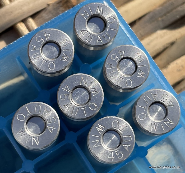 £2.45 each .45ACP Open Cartridge : £2.75 each : These are very latest release. Very quick to use and louder than the MGC .45ACP's. Cartridges take 1x 7mm PFC Primer Caps (requires Open cartridge detonator chamber (see below) ::cartridges are reusable Open Cartridge (7mm PFC Cap) Detonator Chamber : £26.95 WIN 45ACP Blowback cartridges: £2.75 each Real Look / Size .WIN 45ACP Lightweight reusable blowback cartridges that can be fired in your 1911 Colt .45ACP Lightweight/ Mild kick blowback cartridges: £3.20 each (reusable / takes 1x PFC primer cap). These are a new design / light weight.