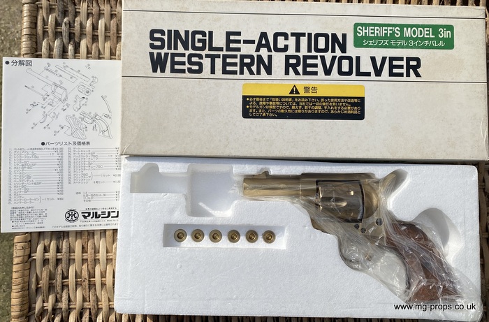 Rare Marushin S.A.A. .45 Sheriff Model All metal with real wood grips. Original gold colour though this can be polished off to reveal a high silver chrome finish Functions / operates like the real thing! In very good condition / appears unfired / Photos above of actual revolver for sale Includes: Original box, original instructions, Six Marushin Colt .45 firing cartridges, in very good condition / unfired (cartridge requires PFC primer cap to produce the bang and smoke). ALL Metal with Real wood grips Weight approx: 930g Barrel Length: 3in" Vents from chamber We ship internationally. Any questions please ask away : sales@mg-props.co.uk PFC Primer caps: £9.50 per box (1 box = 100 PFC caps) These are needed to make the bang and smoke Colt S.A.A. .45 Real Look Dummy bullets Real look Colt .45 bullets with correct marking, great for display with your S.A.A. .45 : Six cartridges : £22.95