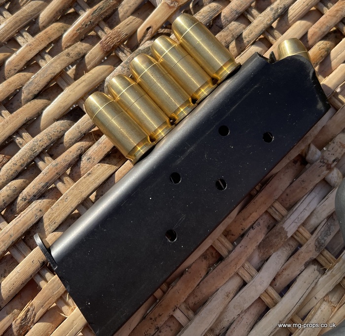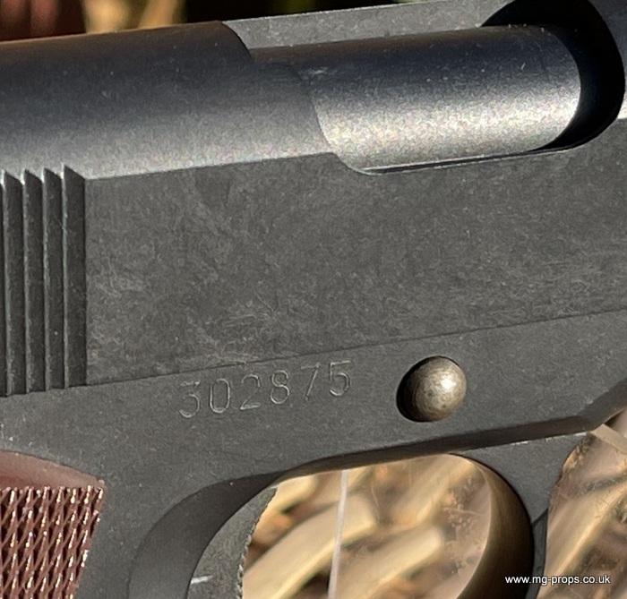 .45ACP Real Blowback cartridges: €28.95 / £21.95 Eight real look / size .45ACP blowback cartridges that can be fired in your 1911 Colt Look like real bullets with .45ACP markings (great for display) but can also be fired in most .45ACP model guns (use 7mm PFC cap) .45ACPmm Real Look `Dummy` Bullets: €28.95 / £21.95 Eight real look / size .45ACP Dummy bullets Look like real bullets with .45ACP markings (great for display) Dummy Bullets `Firing Pin`: £12.95 Using this firing pin allows you to cycle the real look dummy bullets Ammo Box: £8.50 Plastic container for .45ACP & 10mm rounds (real looks or blowback) Keep your ammo neatly stored Real Gun Grips: £31.95 Pachmayr wrap round real gun grips: Pearl Grips: £31.95 Pearl style 1911 grips Wood grips: £23.95 1911 wood grip metal Colt logo (also available without Colt logo) : Diamond check (Diamond and checker 1911 grips available )