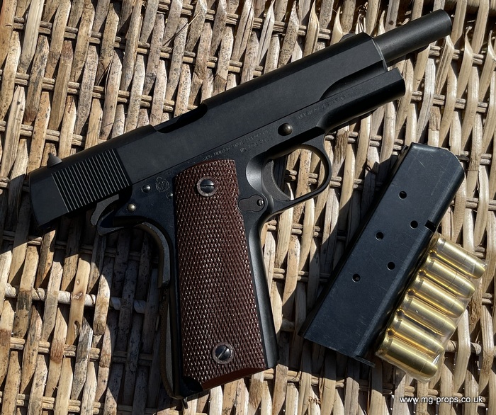 Dept. These changes incorporate the following items (see picture above): The improved design was adopted by US Military as M1911A1 pistol, and served with distinction until the mid-1980s, when it was officially replaced in service with M9 pistol (US-made Beretta 92FS). Along with Colt, countless numbers of companie in the USA and other countries manufactured more or less exact copies of the M1911. Some millions of guns were manufactured in the USA during the WW2 by numerous companies under US Government contracts, and probably even more were manufactured for commercial sales. Most common M1911 clones are manufactured by: Springfield armoury, Les Baer, Kimber, Wilson, STI, Para Ordnance and many, many others. Also, many M1911-partterned pistols are still custom built for service duty, sport shooting and self defence. The Colt Gov't / M1911 is probably the most popular pistol in the world. It is known for its reliability, serviceability, simplicity. Custom made M1911s capable of outstanding accuracy, and many of M1911-patterned guns are still in service with different military and law enforcement agencies in the USA. Any questions: sales@mg-props.co.uk We internationally. Please ask for a shipping quote